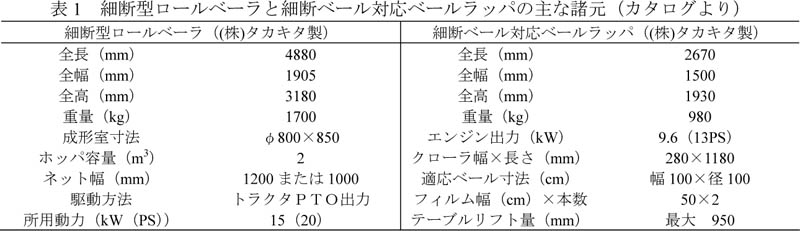 - 供試機は、同時に牽引される2条刈りコーンハーベスタにより細断コーンをコンベヤ付チャンバに受け、これをベール成形室にまとめて送り込むことにより直径約80cm、幅約90cmのベールを梱包する定径型ロールベーラである。細断ベール用の自走式ベールラッパは9.6kW(13PS)のガソリンエンジンを搭載したクローラ自走型である。適応ベール寸法は幅100cm、直径100cmである(表1)。