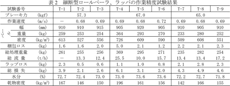 - 精度試験の作業速度は0.68〜0.72m/sでベール重量は233〜364kg、密度は510〜726kg/m3である。梱包時のロスは1.6〜5.0kgで、その重量割合は0.4〜1.4%である。ラップ時のロスは0.5〜2.8kgで、総損失は約0.8〜1.8%である(表2)。