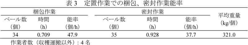 - 細断型ベーラの成形室後方に自走式ベールラッパを配置し、ホイールローダで細断コーンを供給し、ラップベールは別のホイルローダで運搬する定置作業の場合、梱包作業能率は47.9個/hである。密封作業能率は37.7個/hで、一個の平均重量は321.0kgとなる(表3)。