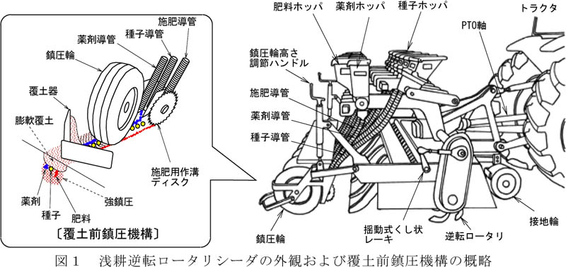 - 開発した浅耕逆転ロータリシーダは、設定耕深が8cmの耕うん装置に、施肥装置、施薬装置、大豆の播種装置および鎮圧装置を組み合わせた作業機である。施薬装置はエチルチオメトン粒剤等の殺虫剤を施用する装置で、慣行で行われる肥料との混和作業が不要になる。また、鎮圧部は播種溝部を強鎮圧したのち、種子上に膨軟に覆土する覆土前鎮圧機構を用いる(図1)。