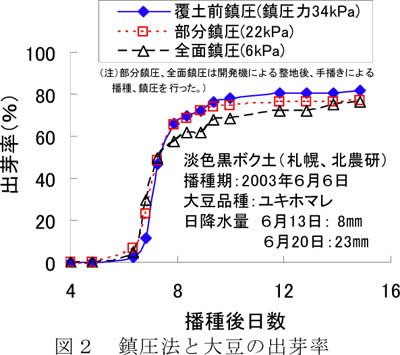 - 覆土前鎮圧で播種された大豆は、種子より下層は強く鎮圧されて毛管水の供給が高く、表層は膨軟に覆土されて降雨後の土膜の形成が抑制されることから、慣行の全面鎮圧や部分鎮圧に比べて出芽揃いが良く、出芽率も高い(図2)。