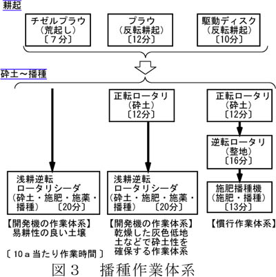 - 浅耕逆転ロータリシーダは、1工程で砕土から播種までの作業を同時に行うことから、慣行の作業体系に比べて砕土以降の工程が少なく、作業時間は1/2〜3/4に短縮される(図3)。