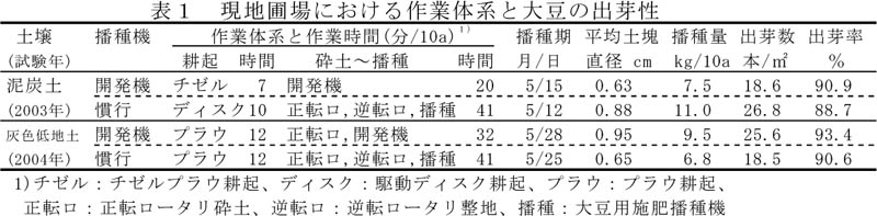 - 浅耕逆転ロータリシーダを用いた播種作業体系は、砕土性の劣る泥炭土や灰色低地土などにおいても慣行と同等の砕土性と出芽性を確保できる(表1)。