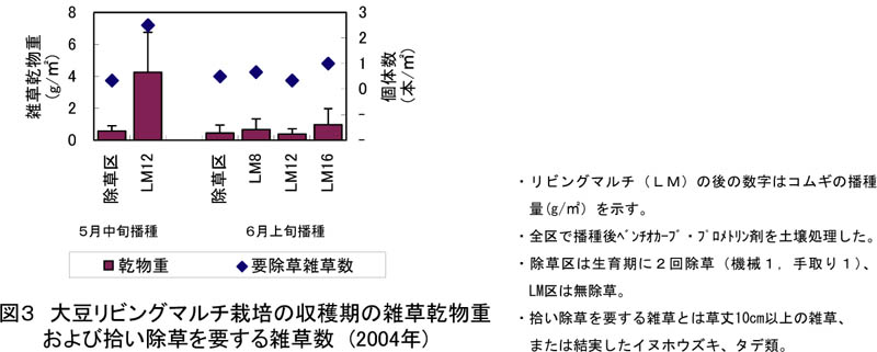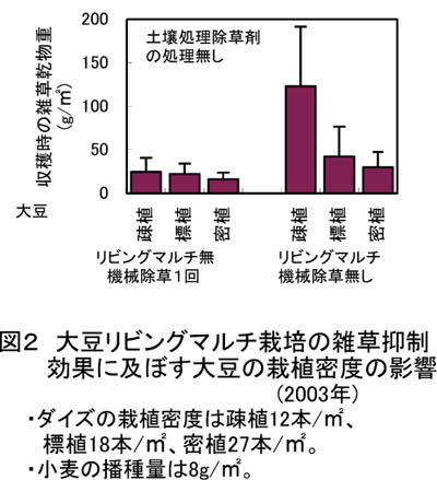 大豆の播種適期に秋まき性の高い小麦を大豆と一緒に播種すると、小麦はリビングマルチとして地表面の被覆を早め、雑草を抑制したのち自然に枯死する。リビングマルチ栽培に加えて大豆播種後に除草剤を土壌処理すると、機械・手取り除草と同程度に雑草を抑え、大豆を密植にすることで雑草抑制効果が高まり、減収も緩和される。