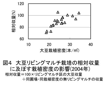 - リビングマルチ栽培では、播種後20日頃まで大豆と小麦の草丈が同じであり、大豆の葉色は開花期まで慣行栽培に劣る。生育初期の競合により大豆の生育は抑制されて減収するが、大豆を30本/u以上の密植とすることにより大幅な減収を回避できる(図4)。
