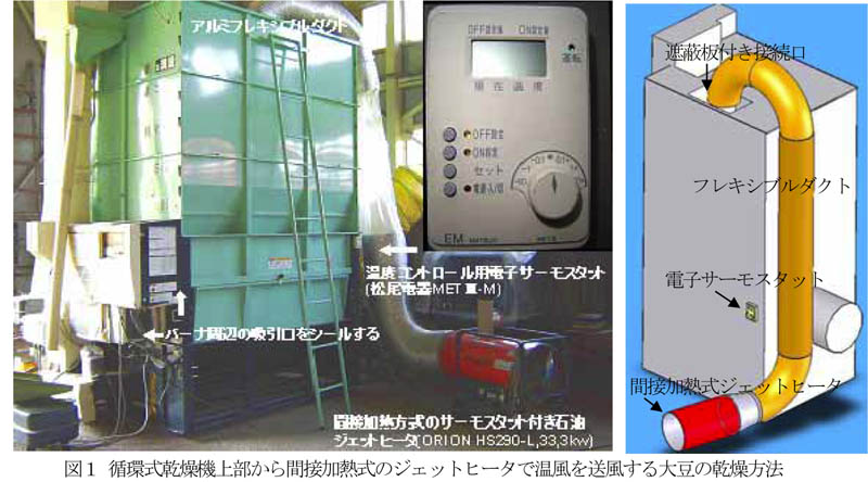 - 既存の汎用型の循環式乾燥機に、外部接点で温度制御可能なヒータと加温した空気を乾燥機上部に導くダクト、温度コントローラからなる装置を付加して、乾燥機の水分計やハンドリグの利便性を利用しながら、損傷の少ない上部から加温する循環併用型の静置式乾燥機として利用する技術である。