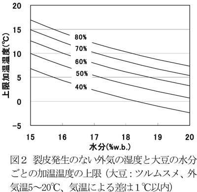 - 損傷を抑えるため、およそ水分17%までは循環せずに外気を通風し、17%以下になったときに加温した空気の湿度が裂皮しない湿度以上になるような空気温度に制御する。加温温度は図2を参考に安全範囲の温度にマニュアルで設定し、子実水分が17%では湿度37〜65%、16%では湿度33〜60%の湿度の空気を通風する。また、約2.5時間程度で一順するように乾燥機の設定を変更し、循環速度を落とす。