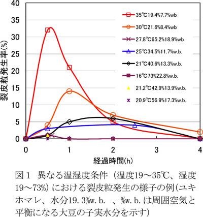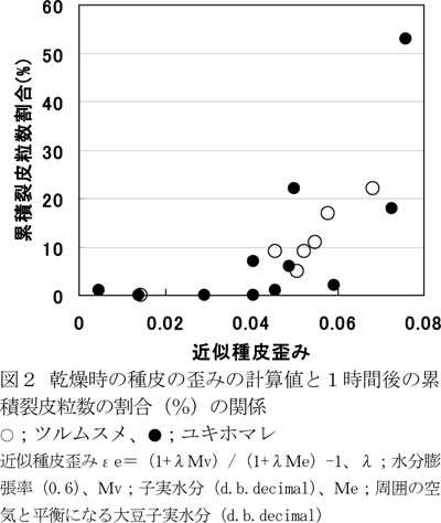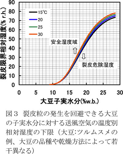 - 大豆の品種(ツルムスメ、ユキホマレ、タチナガハ、フクユタカ、タマホマレ、エンレイ)ごとに恒温・恒湿条件下で調べた経時的な裂皮粒の発生割合(例として図1)から、種皮における歪みと裂皮粒発生割合の関係を求め(図2)、水分に対する種皮の裂皮限界歪み特性を推定し、大豆の平衡水分曲線から品種別、温度別の湿度の下限を求め(図3)、送風空気温度の加温温度の上限を算出する。