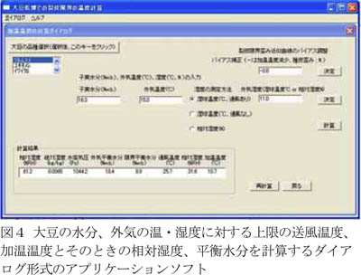 - 以上の方法による加温上限温度を算出するプログラムを作成し、大豆の品種、水分、外気の温・湿度をダイアログ形式で入力することによって上限通風温度、加温上限温度、相対湿度、通風空気と平衡な大豆の水分を計算し、表示する(図4)。湿度の形式は湿球温度(通風あり、なし)、相対湿度の選択が可能である。ユーザが品種や条件によってバイアス補正を調整することもできる。