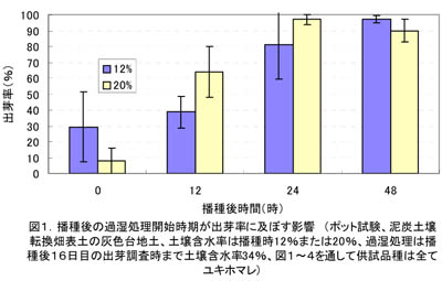 - 播種された種子は土壌中の水分を吸収し、播種前に予備吸水処理をうけた種子のように、過湿条件に耐えることのできる生理状態へとコンディショニングされるが、播種後24時間前後まではコンディショニングは十分でない(図1)。