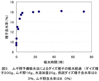 に、一定量の水(添加量は図3を参照)を加え混合し湿らせた後、大豆種子を加え均一に混合し、ビニール袋等の密閉容器に保存するものである。この方法では、処理開始後10時間目頃に種子含水率が目標含水率に達し、その後は一定となる。(図3)。