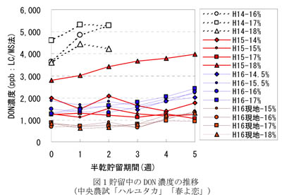 - 小麦の二段乾燥において、無通風での半乾貯留中、子実水分14〜18%では小麦中のDON濃度は増加する確率が高く、この傾向は貯留開始時のDON濃度が高い場合に顕著である(図1)。このため、DON濃度2000ppb以上の小麦では速やかに本乾燥を行い、DON濃度の増加を回避する必要がある(図1)。