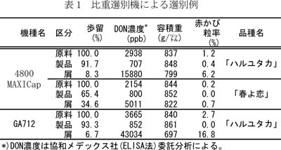- 比重選別機によってDON濃度を暫定基準値以下に調製することが可能である(表1)。