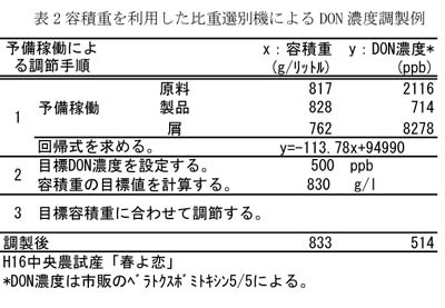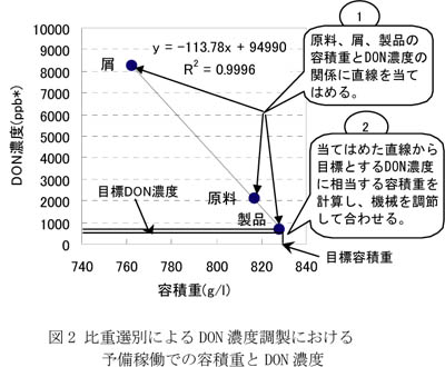 - 小麦の比重選別における原料、製品、屑のDON濃度は、容積重と相関が高く、直線に回帰できることから、最初に比重選別機を予備稼働(約30分間)して得た製品と屑および原料のDON濃度を市販のエライザキットで測定する(所要時間65分)。次に、それぞれのサンプルのDON濃度と容積重の関係より容積重の目標値を求め、比重選別機を調節することにより、DON濃度を目標値以下にできる(表2、図2)。