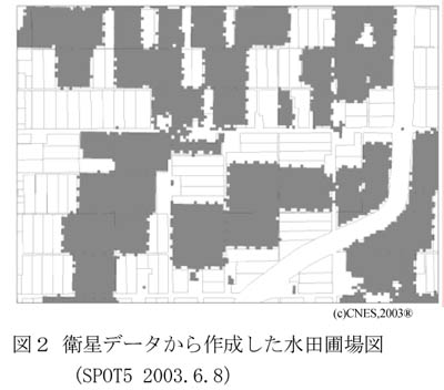 (4)衛星データから作成した水田圃場図は、圃場レベルでの水田把握には限界があるが、市町村レベルで水田の地理的分布を把握するデータとして有効である(図2)。