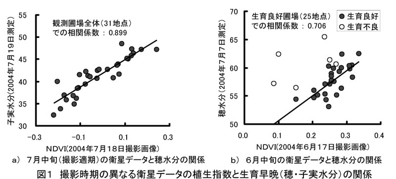 - 収穫開始1〜2週間前に相当する7月中旬の衛星画像から求めた小麦圃場の正規化植生指数(NDVI,式1)は、収穫前の子実水分と高い相関を持ち、小麦生育の早晩の判断に利用できる(図1-a)。