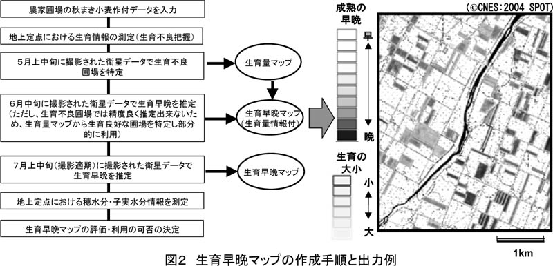 収穫開始1〜2週間前の7月中旬に撮影された衛星画像から求めた正規化植生指数(NDVI)は小麦生育の早晩と高い相関を持つ。これより作成した小麦生育早晩マップを活用することで、共同利用時の収穫機械および乾燥調整施設の有効利用が可能である。