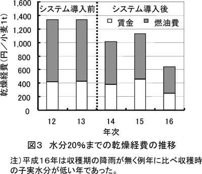 - 広域の小麦生育早晩を統一した尺度で順位づけることができるため、収穫子実水分の格差が減少してコンバインの負担面積が拡大する。また、乾燥調製施設への受け入れ水分の低下と均一化により、乾燥経費の節減が図られる(図3)。