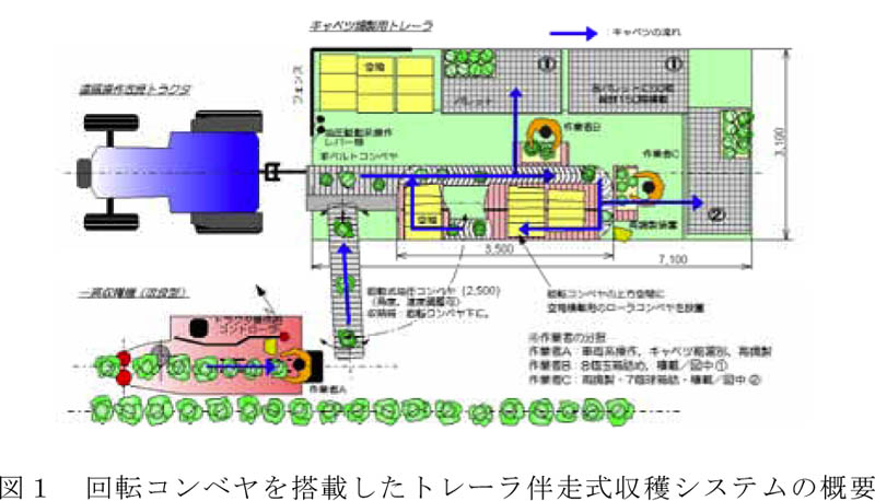 トレーラ伴走式のキャベツ機械収穫において、回転コンベヤを用いることにより、トレーラ上の作業者は調製・箱詰作業を一定のペースで行うことができ、キャベツの処理速度を4.1秒/球から3.3秒/球へと向上することができる。これにより直進時の作業速度は秒速12.0cmから13.5cmに高速化でき、経済性も向上する。