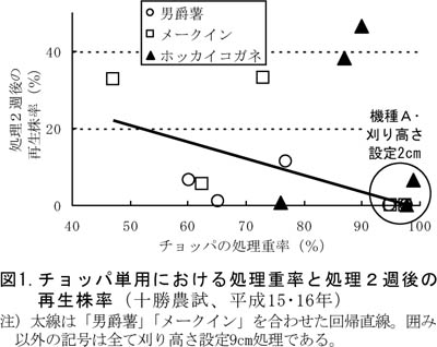 - 「男爵薯」および「メークイン」では、刈り高さを低く設定できる自走式チョッパは再生が認められず、種馬鈴しょ生産への利用が可能である(図1)。トラクタ直装式チョッパでも、刈り高さ設定を低くすると処理重率が高くなり、茎葉の再生が少なくなる。