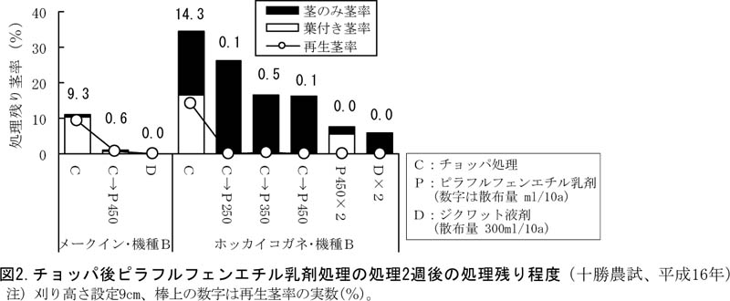 - チョッパ処理後5日以内にピラフルフェンエチル乳剤を散布する茎葉処理法が、確実な枯凋促進と茎葉再生抑制の点から最も有効である(図2)。ピラフルフェンエチル乳剤の薬量250〜450ml/10aの範囲では、処理2週後の葉付き茎率や再生茎率の差はほとんどない。