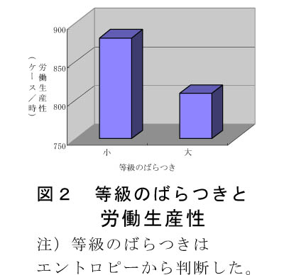 - 選果作業の労働生産性は、搬入されたトマトの等級がばらつく時ほど低下していた(図2)。とりわけ、規格外品の発生率が高まる時ほど、労働生産性の低下が認められた。また、箱詰め作業の労働生産性は、規格ごとの出現玉数が不揃いな時ほど低下していた(図3)。