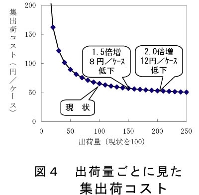 - 出荷量を増加させることは、減価償却費等の固定的な費用の抑制につながり、集出荷コストの低下に結びつくことが認められた(図4)。また、閑散期の10月の人件費は割高となっていることから、施設の稼働期間内における出荷量を平準化させていくことが、人件費の抑制に効果をもつことが認められた。