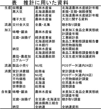 - 道内で製造される味噌の使用原料に占める道産大豆の割合は38%になるが、そのほとんどは道内の家庭で消費される豆腐と違って、業務用に回る製品が多く、「地産地消割合」は19.2%である。納豆も、北海道では特に家庭消費量が多い品目であるが、道外メーカーのブランド力が強く、製品段階での移入が多いことから、その「地産地消割合」は5%と低くなっている。