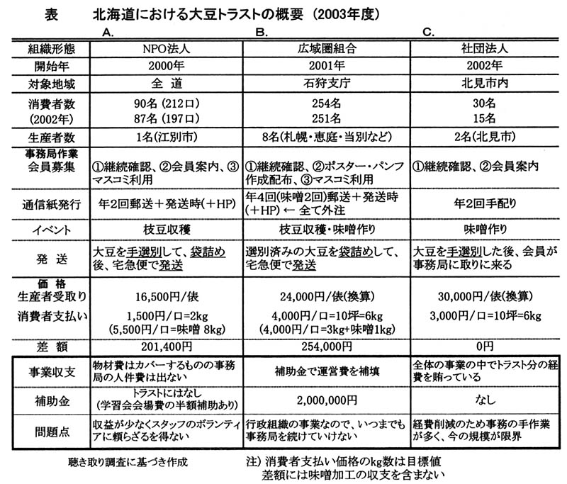- 現在、北海道に存在する3つの大豆トラストは、それぞれ事業主体・対象地域と産消の規模・事業内容などは異なっているが、何れも収支が不均衡であり、事務局の人件費が賄えないことから、これ以上の拡大は困難であるという問題を共通に抱えている(表)。行政組織が主体となるBでは、運営費を助成金により補填している。一方、A(NPO法人)とC(社団法人)では、会員のボランティアにより人件費の負担を圧縮している。Bも事業の終了時には同様の対応が迫られることになるため、今後のトラストの維持・拡大には、会員消費者の自発的な行為を誘発することが重要である。