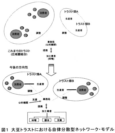 - ボランティアを積極的に活用し、事務局の作業負担を軽減するには、トラスト畑を産地ごとに分割し、生産者と消費者との直接的な結び付きを重視した組織体制に再編することが有効である。その場合、全国的に大規模な展開をしている日本消費者連盟のトラストのように、専従事務局には産地間のネットワークの情報交換を媒介する機能と全体を代表する窓口機能を果たすことが特に求められる(図1)。また産地のリーダーとなりうるような消費者を組織活動の中で事務局が選び出し、養成することも必要である。