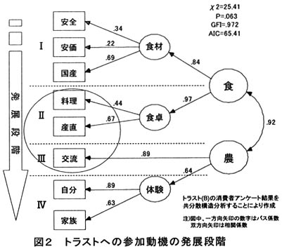 - トラスト(B)の消費者アンケートによると、安全で安価な、とりわけ国産の「食材」を調達することを求めて参加した者は、価格等の条件の変更次第で継続しなくなる可能性が高い(図2)。一方、参加動機がU.料理の学習や産直による「食卓」の充実→V.生産者との「交流」→W.自分あるいは家族の農業「体験」と展開するにつれてトラストへのコミットメントは強くなるという結果も得られている。