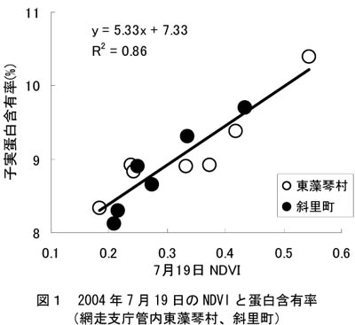- 衛星データで観測された秋まき小麦の登熟期間の赤・近赤外波長放射輝度、正規化植生指数(NormalizedDifferenceVegetationIndex:NDVI)と子実蛋白含有率との相関は、調査全年次、地域を通じて高く、特にNDVIと子実蛋白含有率との相関は安定していた。おおむね標準的な収穫時期の3〜4週間前以降の衛星観測によるNDVIを用いて子実蛋白含有率を推定し、区分図を作成することができる(図1、図2)。