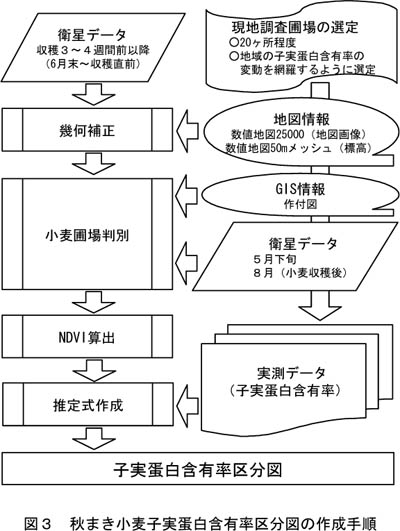 - 衛星データから秋まき小麦子実蛋白含有率区分図を作成するための手順を示す(図3)。