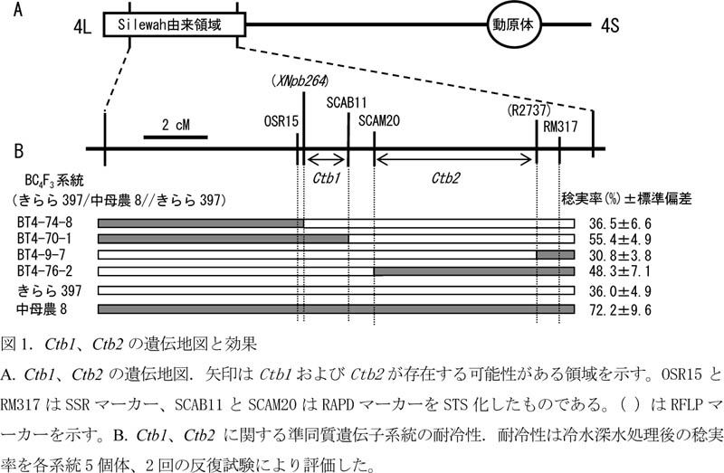 - 「中母農8」の第4染色体長腕には2つの耐冷性遺伝子Ctb1とCtb2が隣り合って存在する。Ctb1の両側にはDNAマーカーOSR15とSCAB11が、Ctb2の両側にはDNAマーカーSCAM20とRM317が存在し、各耐冷性遺伝子の育種選抜に利用できる。(図1A)。