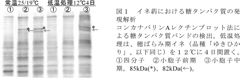 - 小胞子期のイネ葯に特異的に蓄積し、低温処理で顕著に蓄積量が低下する分子量約85kDa及び82kDaの糖タンパク質が存在する(図1)。