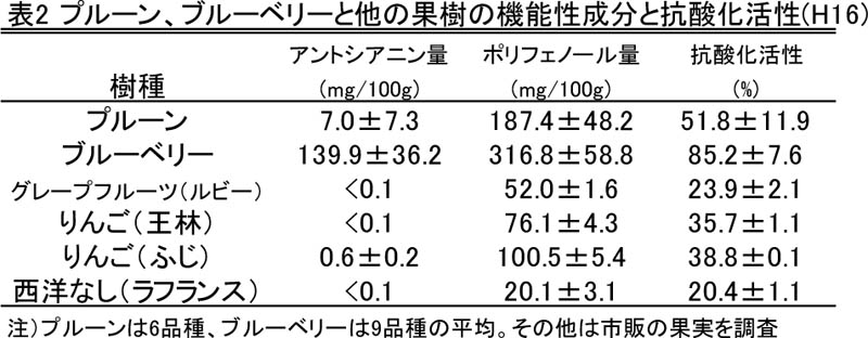 (2)プルーンはブルーベリーとともにグレープフルーツ、りんご、西洋なしに比べて抗酸化活性が高い(表2)。プルーン品種の中では「チェーアン」が抗酸化活性が高い(表1)。