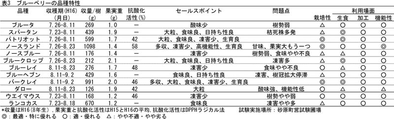 (2)樹冠の拡大が順調なのは「パトリオット」「バークレイ」「ノースランド」で収量もこれら3品種で多い(表3)。