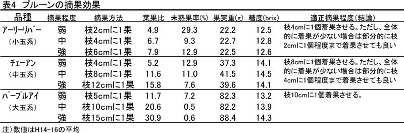 (2)適正な摘果程度を明らかにするため3水準の摘果程度を検討したところ、弱摘果は食味不良な未熟果の発生が多くなり、「パープルアイ」では毎年糖度が低い。しかし、弱摘果は無摘果ほどの悪影響はない。中摘果と強摘果では果実品質にほとんど差がない。以上の結果から、収量等を考慮し、適正な摘果程度を示した(表4)。