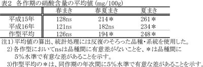 - 硝酸含量については、2か年ともに夏まきの作型で有意な品種間差がみられ、「スクープ」「サンパワー」「晩抽ジュリアス」は硝酸含量が高い傾向を、「SC7-405」は硝酸含量が低い傾向を示す。作型間では、春まき<春夏まき<夏まきの順で硝酸含量が高くなる(表2)。