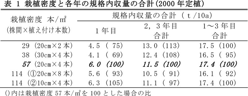 - 栽植密度57本/u以上では1〜3年目の収量に差は無く(表1),栽植密度が高いほど葉幅は狭くなるため(図1),57本/uを超える栽植は不要である。