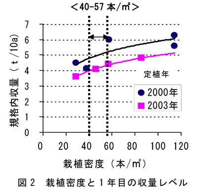 - 栽植密度29〜57本/uでは,栽植密度が低いほど1年目収量は低いが,2,3年目の収量では低密度ほど収量が多く,葉幅も広く維持される(表1,図1)。現在の現地収量レベルである4.0t/10aと同程度の収量を得るためには,栽植密度を40本/u以上とする必要があり,適正栽植密度は40〜57本/uとする(図2)。