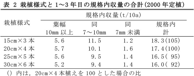 - 栽植密度を一定とした場合の株間と株あたり植え付け本数との組み合わせでは,株間を広くして一ヵ所に5本以上植えつけるより,株あたりは3〜4本とすると規格内収量が多く,葉幅7mm以上の割合も多い(表2)。
