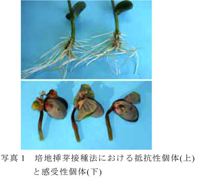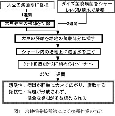 - ダイズ茎疫病のレース特異的抵抗性について高精度、効率的に評価できる幼苗接種検定法(培地挿芽接種法)を開発した(図1、写真1)。