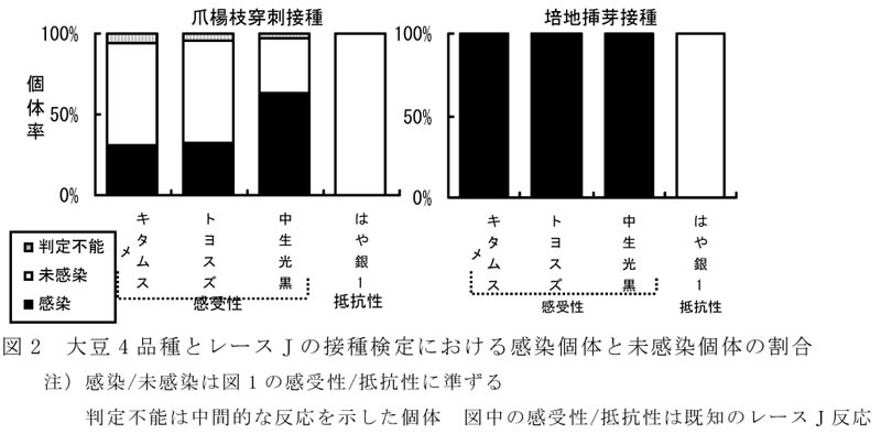 - 従来の爪楊枝穿刺接種法では感受性の大豆とレースの組合せでもエスケープが多く、判定精度が劣ったが、培地挿芽接種法ではエスケープが認められず(図2)、作業効率も高かった。