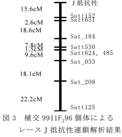 - 「トヨコマチ(レースJ感受性)」×「はや銀1(レースJ抵抗性)」(植交9911)のF2個体-F3系統を用いて、レースJ抵抗性のおおよその位置を明らかにした(図3)。