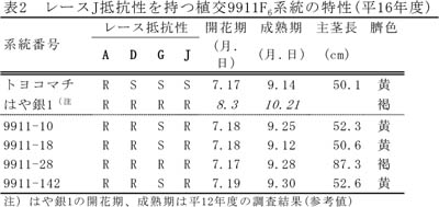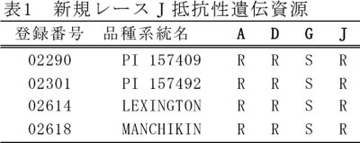 - レースJ抵抗性により遺伝資源4点および植交9911F64系統を新たに選定した。これらについて主要レースとされるA、DとGについて抵抗性の評価をおこなったところ、レースD、Aに対してはすべてが抵抗性であったが、レースG抵抗性を示したのは1系統のみであった(表1、表2)。