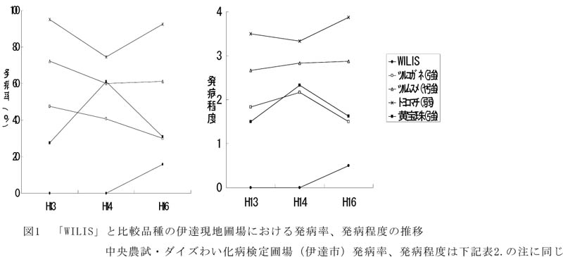 - 「WILIS」(植物遺伝資源センター登録番号21085)は、複数年の試験において既存の抵抗性品種および遺伝資源より常に発病が低く抑えられていた(図1)。