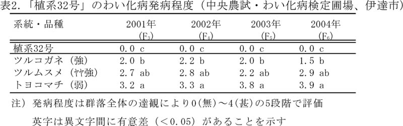 - 植交9901(「樺太一号」×「WILIS」)の後代から、「WILIS」並のわい化病抵抗性を持ち熟期と草型が改善された「植系32号」を育成した。同系統は伊達現地圃場のわい化病激発条件下においても病徴がほとんど認められず(表2)、十勝のわい化病現地多発圃場でも発病が低く抑えられており(成績省略)、抵抗性「強」のツルコガネより高度な抵抗性を示した。