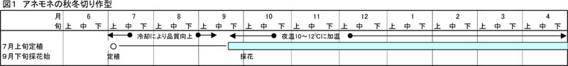 [要約]アネモネの7月上旬定植では9月下旬から採花でき、コンテナ冷却により年内収量が増加し、良花率も高まる。ラナンキュラスでは短日処理やコンテナ冷却により秋期出荷が可能となり、収量・品質も高まる。チューリップでは1〜6月切りの作期について主要12品種の特性を明らかにした。
