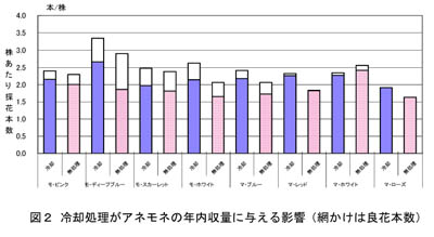 - アネモネは7月上旬定植で9月下旬からの採花となり、翌年4月まで採花を続けることができる。夏期にコンテナを冷却すると単価の高い年内の収量が増加し、良花率も高くなる(図1)。品種別ではマリアンヌ系品種よりモナリザ系品種の方が収量は多いが、良花本数では差がない(図2)。コンテナに定植してから9月下旬までは露地で管理でき、秋出し品目の後作としても導入可能である。その際は遮光するなどしてできるだけ涼しい条件で管理する。用土の低コスト化のために木質粉砕物(植繊機スギ間伐材)を利用することが可能である。